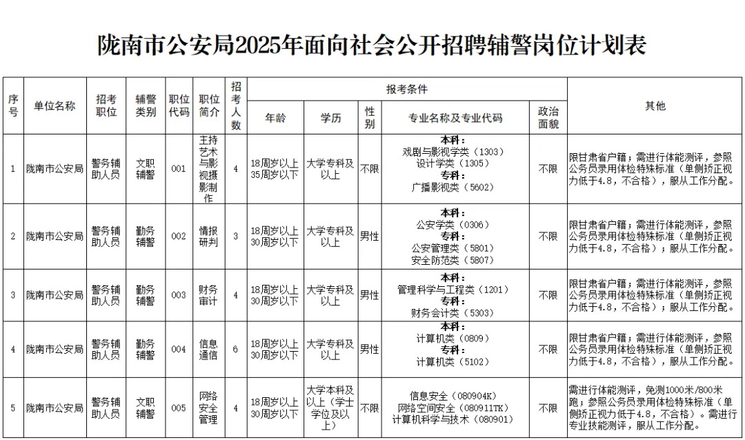 陇南市公安局2025年招聘69名警务辅助人员公告