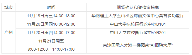 本次招聘将在中山大学、华南理工大学举行系列宣讲活动,宣讲会接受考生现场报名、现场确认和资格审核。高校宣讲时间和地点如下: