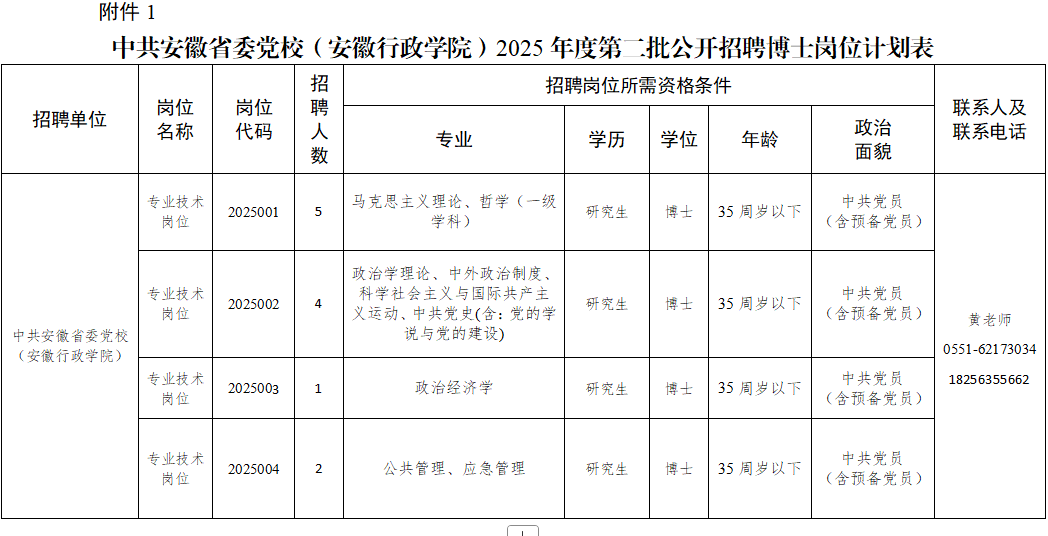 附件:1中共安徽省委党校(安徽行政学院)2025年度第二批公开招聘博士岗位计划表